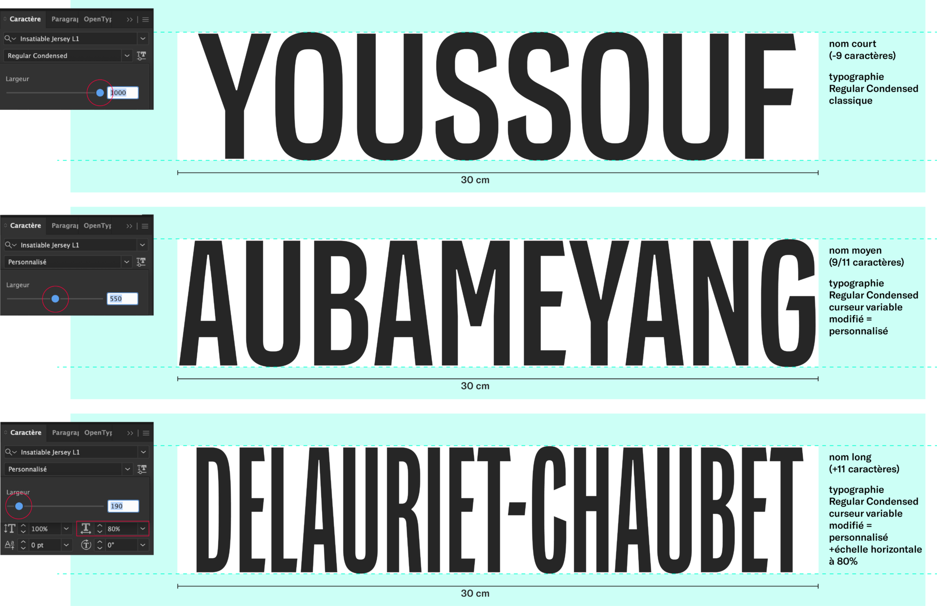 Tout les noms de joueurs sont traités avec la typographie Insatiable Jersey et son curseur variable de lettrage plus ou moins compressé. Cette compression est possible grâce à un curseur intégré à la typographie, permettant de varier la largeur des caractères pour arriver à la largeur voulue à utiliser avec les logiciels d’Adobe CC Suite. La compression ne se fait donc plus manuellement, mais directement dans le logiciel, via la fenêtre dédiée.
