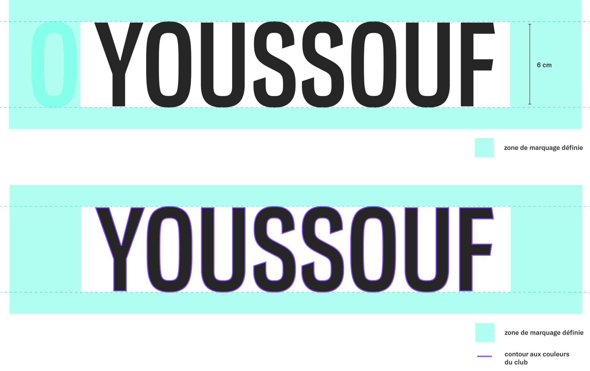 La zone de marquage des lettres des noms ne doit pas dépasser les 6 cm de hauteur, les 30 cm d’encombrement horizontal pour les maillots officiels et réplica adultes, et 27 cm pour les maillots réplica juniors.