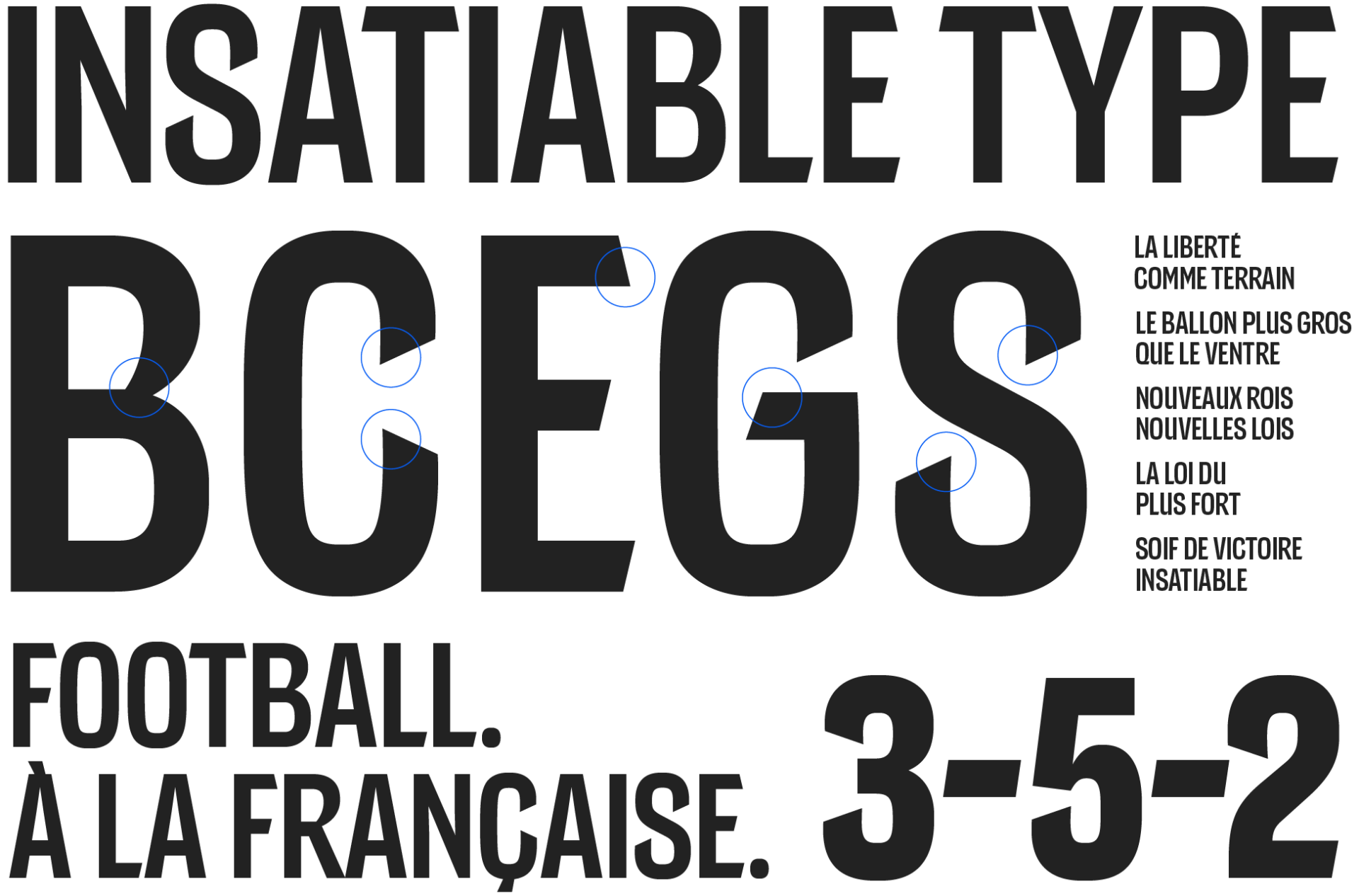 Trois familles de notre typographie Insatiable ont été développées pour des utilisations différentes au sein de notre marque comme le titrage, l’habillage TV et les les marquages des équipements (maillot & short).